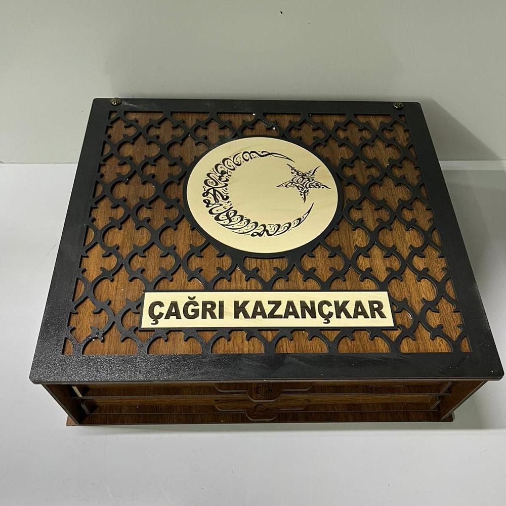 30'lu Ay Yıldız Motifli Çekmeceli Kişiye Özel Ahşap Tesbih Kutusu